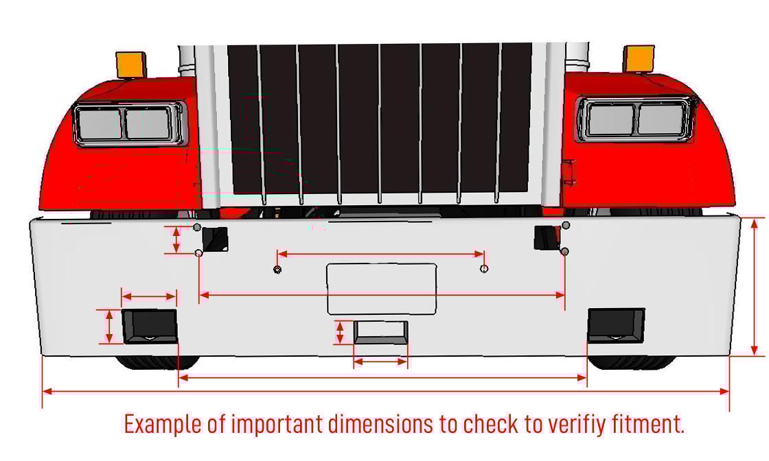 Repeat the above steps to measure a curved bumper, but measure the overall width from tip to tip close to the tires—secondly, the mounting width of the bolts or brackets. The bumper shape is determined by its application (truck model) and various cutout locations for options.